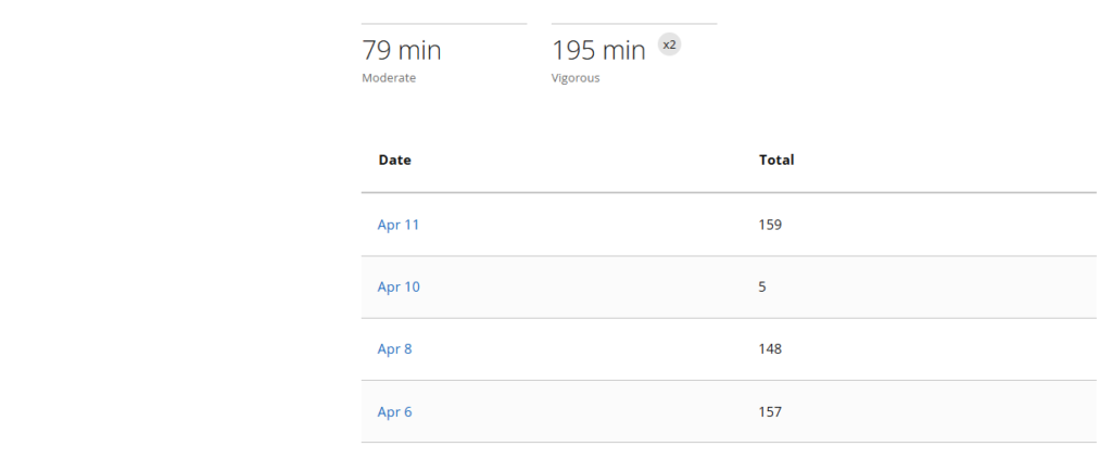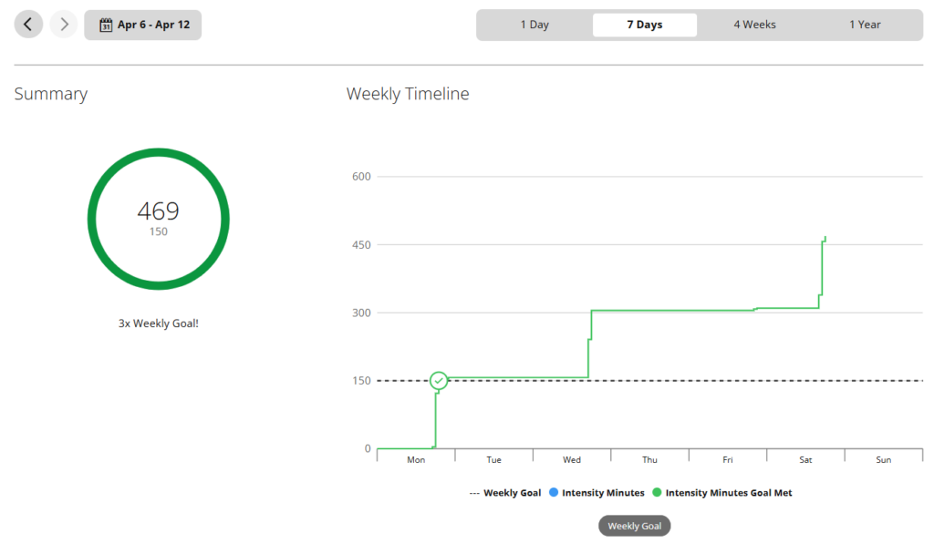 - Wednesday, Apr 8 – ran 6 miles on the treadmill – 148 Intensity Minutes. Already doubled the weekly target!